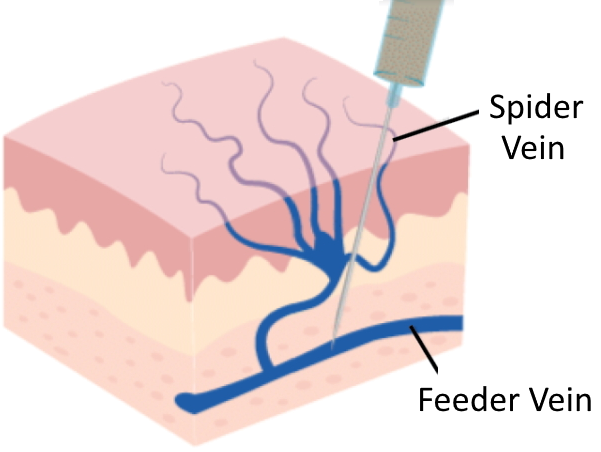 Sclerotherapy is the most common treatment for spider veins and small varicose veins. The procedure is minimally invasive without the need of anesthesia. Sclerotherapy treats spider veins visible at the surface of the skin. Physicians also use sclerotherapy aided by ultrasound guidance to treat veins that are deeper under the skin surface.